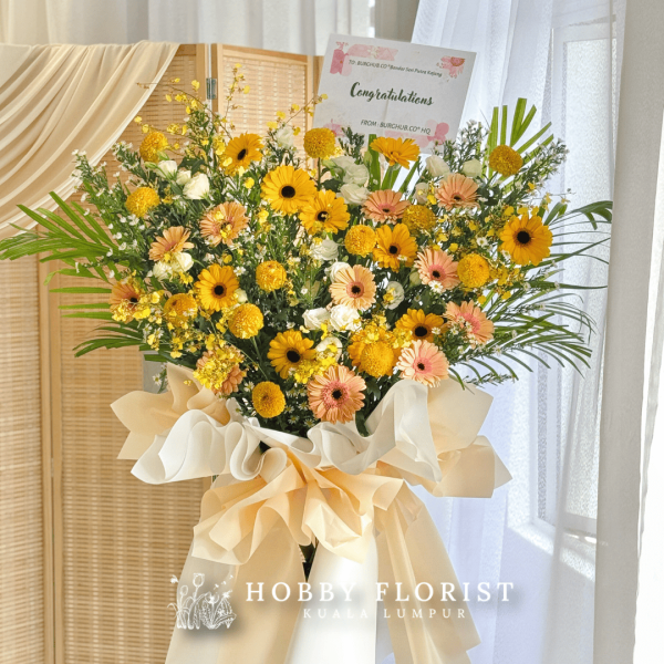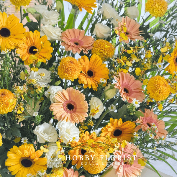 Featuring: An assortment of Yellow and Peach Gerbera, Dancing Lady, Eustoma White, Brown Yellow Ping Pong and Fillers (subjected to availability)