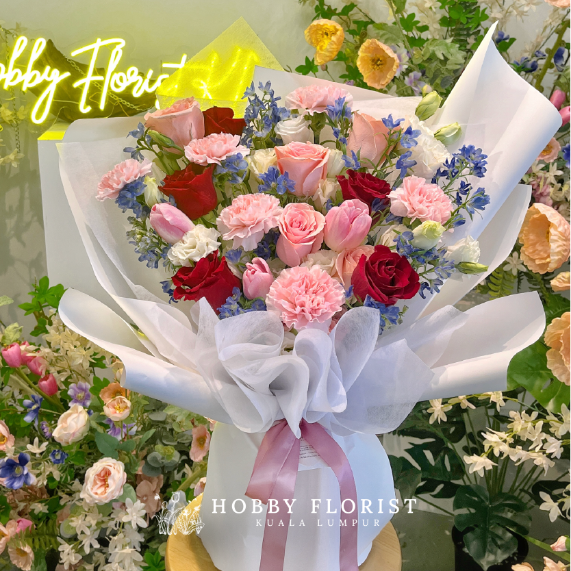 Featuring: An assortment of Mixed x 8 ( Red & Pink ), Holland Pink Tulip x 2, Pink Carnation x 6, White Eustoma, Mini Blue Delphinium & Mixed Different Foliage (subjected to availability)