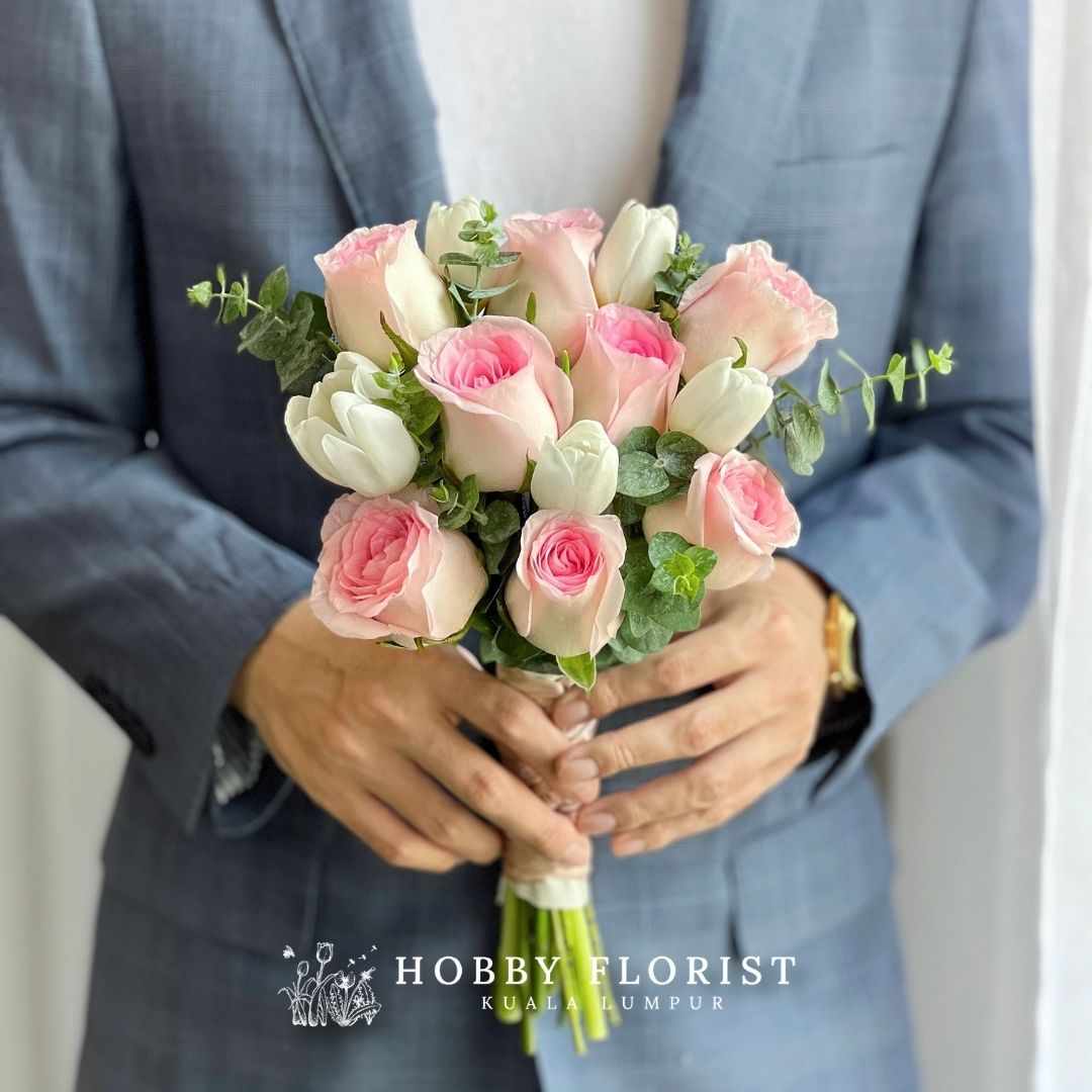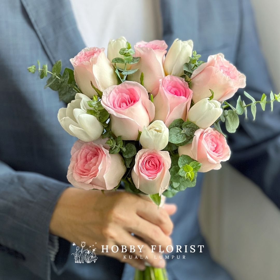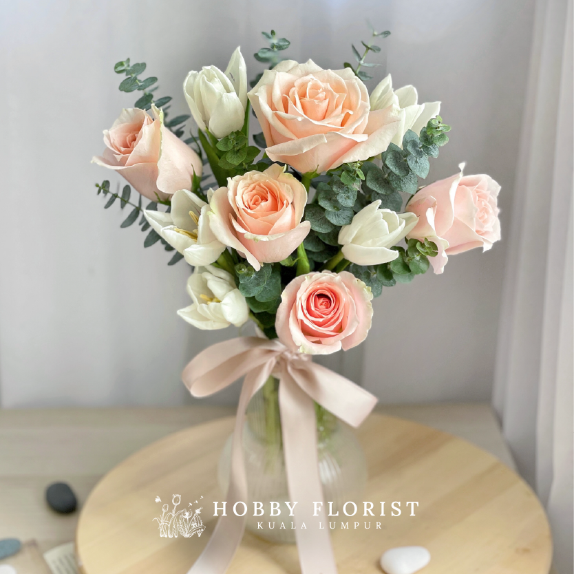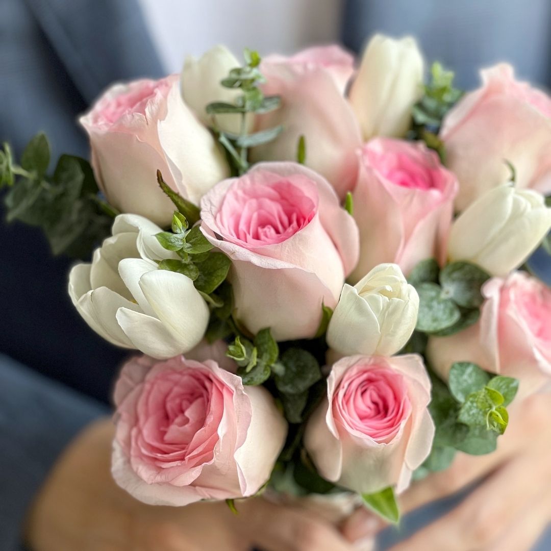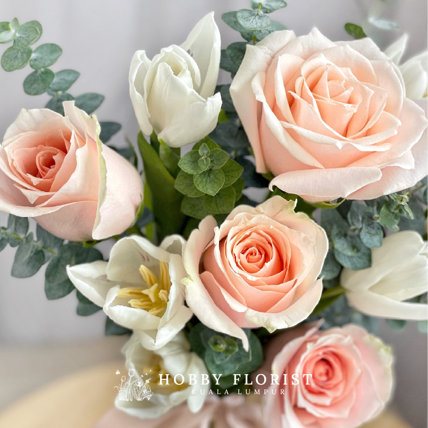 Featuring: 9x Kenya Champagne or Pink Rose & White Tulip & Eucalyptus