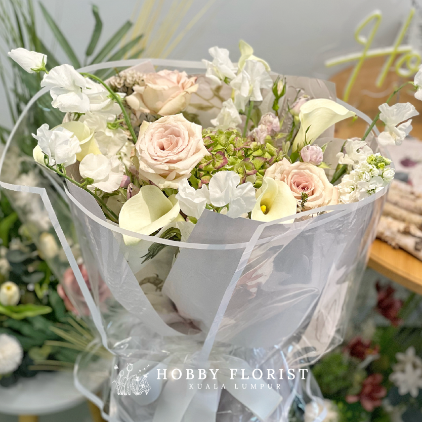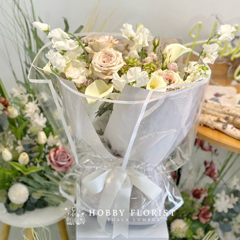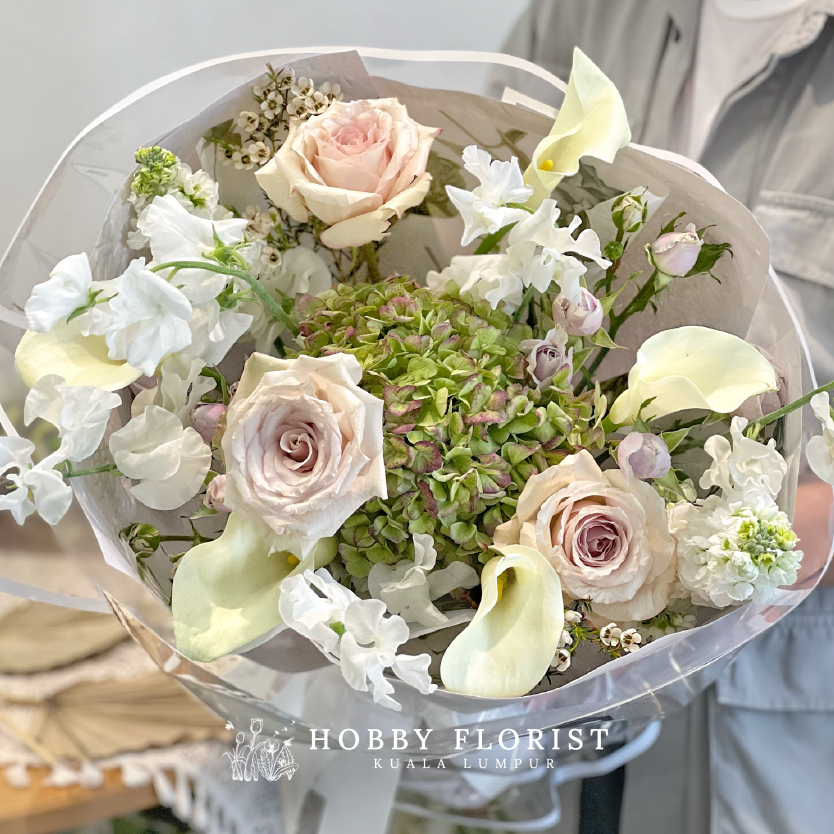Featuring: An assortment of Premium Quicksand Roses x 3, White Matthiola x 2, Green Hydrangea x 1 , White Wax Flower, White Calla Lily x 5, Spray Rose, Sweet Pea & Mixed Different Foliage (subjected to availability)